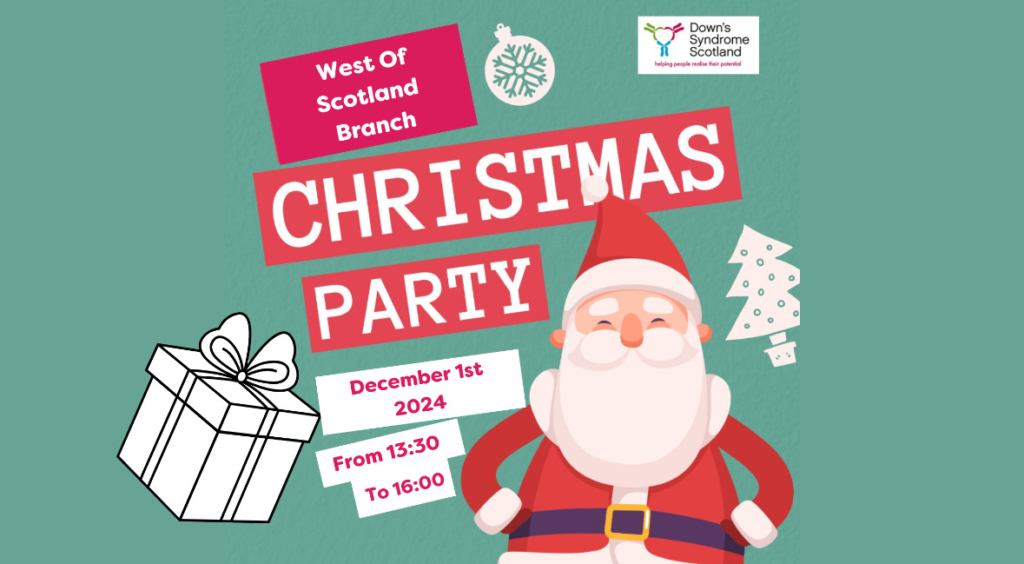 We are excited to invite you and your family to our festive event for Down’s Syndrome Scotland West of Scotland Branch – our Christmas Party on Sunday, 1 December 2024, from 13:30 to 16:00 at Parish of Christ the King Hall Glasgow!